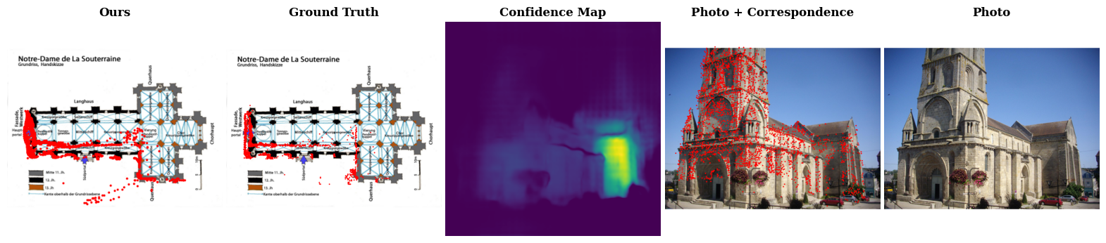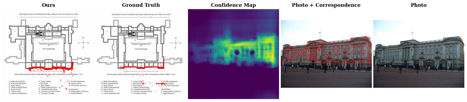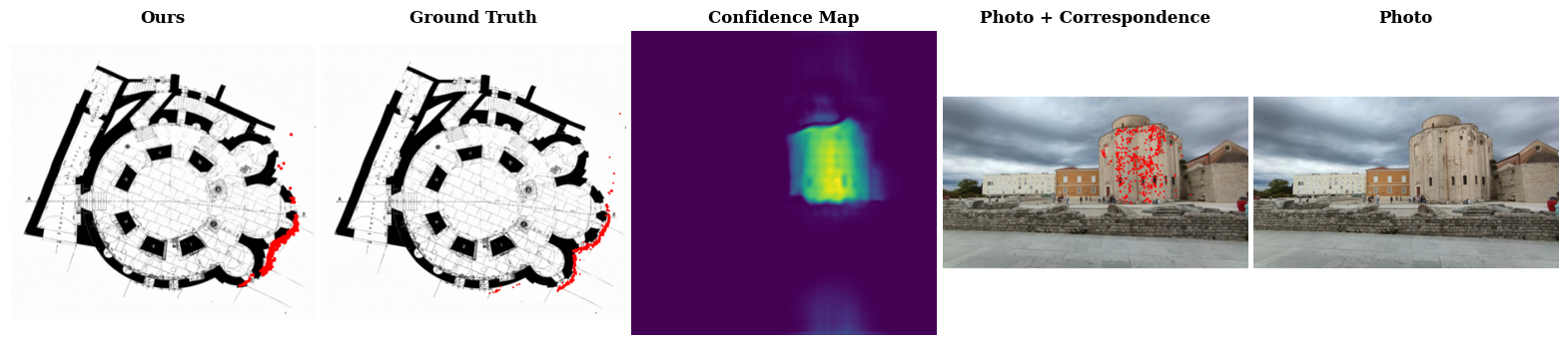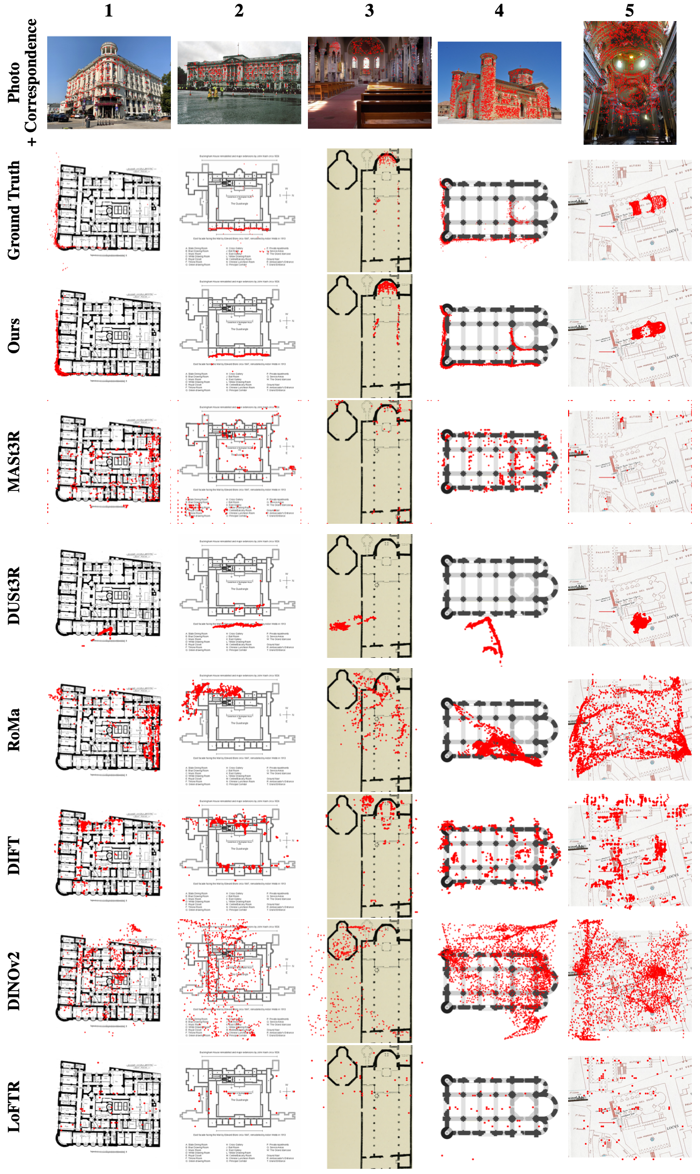 We evaluate our dataset with a combination of sparse, semi-dense and dense matching algorithms: SuperGlue, LoFTR, DINOv2, DIFT, RoMa, and MASt3R. We also evaluate on DUSt3R. While the correspondence baseline results were rather poor, we observe promising geometric structures in DUSt3R outputs; the model only needed to learn the 2D translations, rotation and scale to align to the floor plan. We therefore leverage the strong geometric prior from the pretrained DUSt3R model and finetune on our dataset.