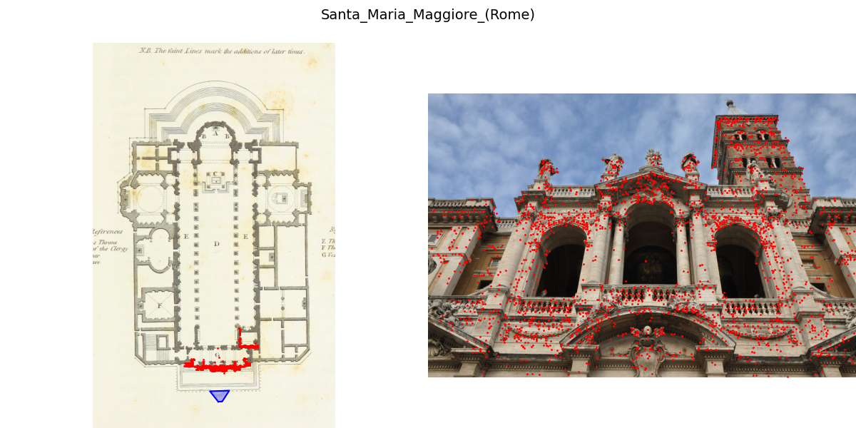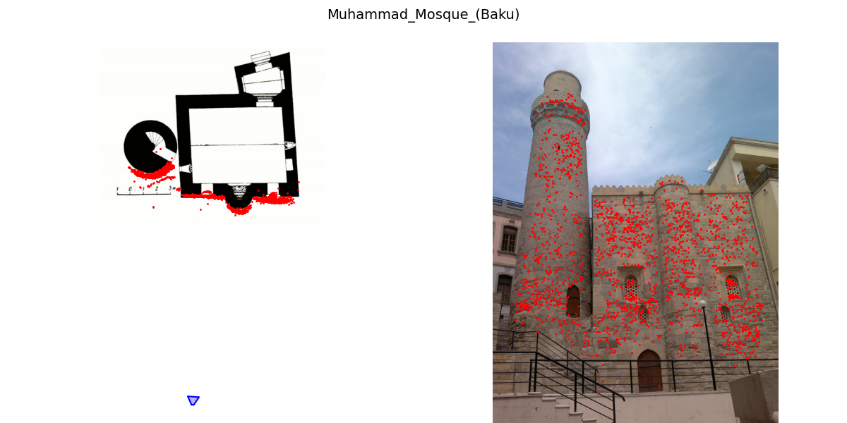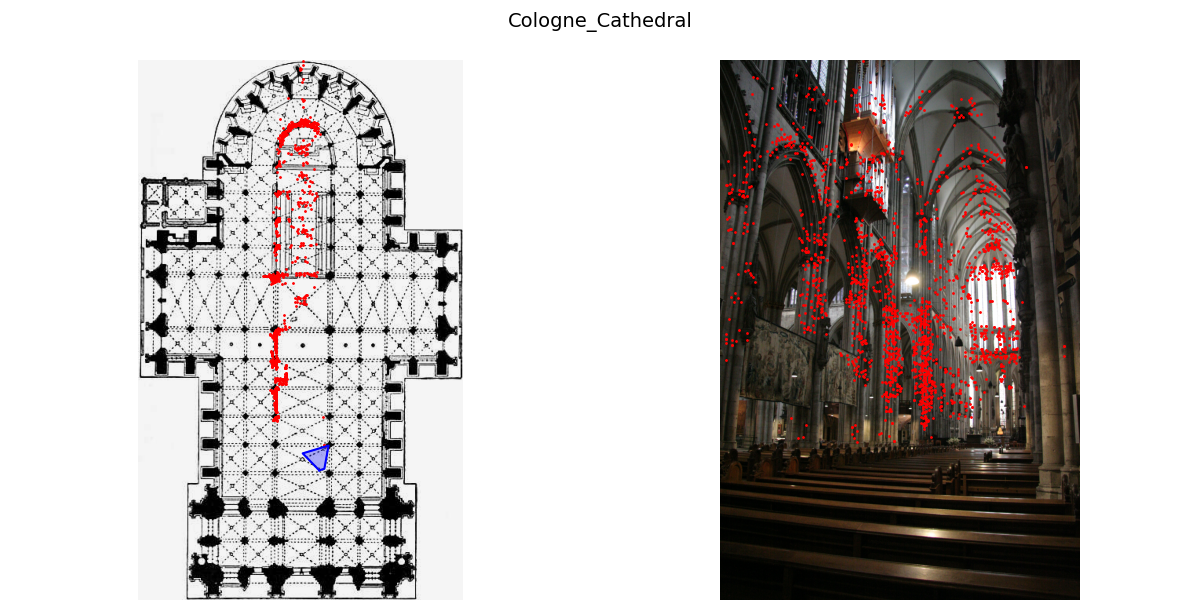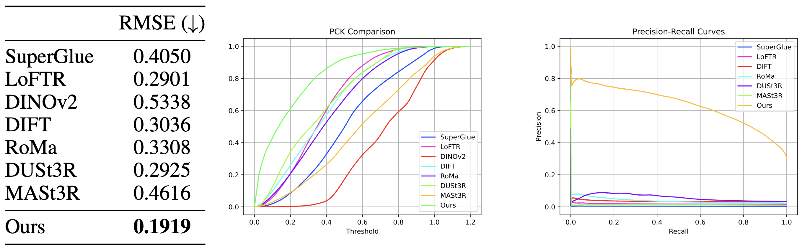 We evaluate our dataset with a combination of sparse, semi-dense and dense matching algorithms: SuperGlue, LoFTR, DINOv2, DIFT, RoMa, and MASt3R. We also evaluate on DUSt3R. While the correspondence baseline results were rather poor, we observe promising geometric structures in DUSt3R outputs; the model only needed to learn the 2D translations, rotation and scale to align to the floor plan. We therefore leverage the strong geometric prior from the pretrained DUSt3R model and finetune on our dataset.