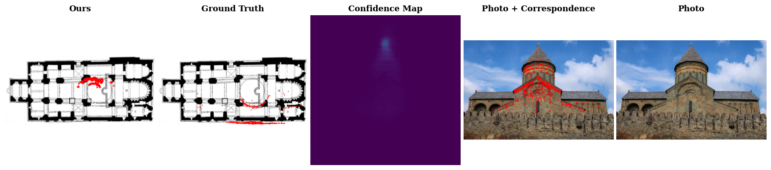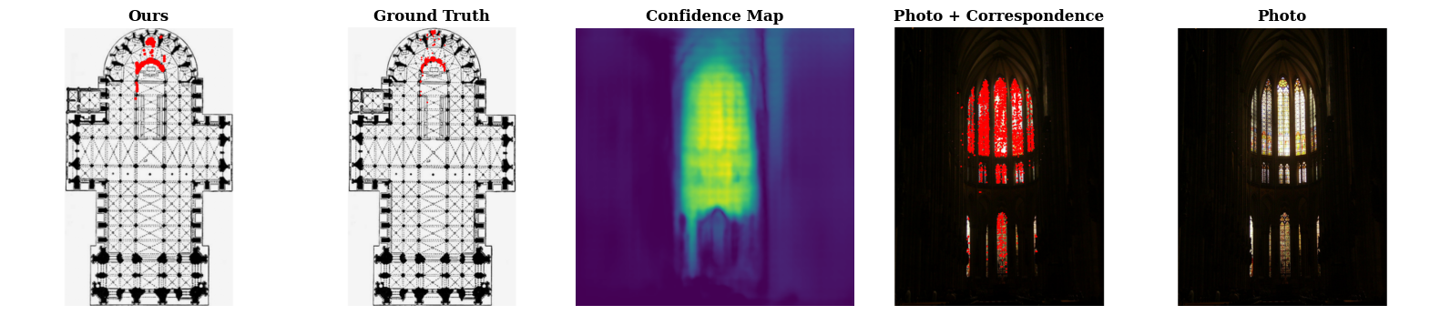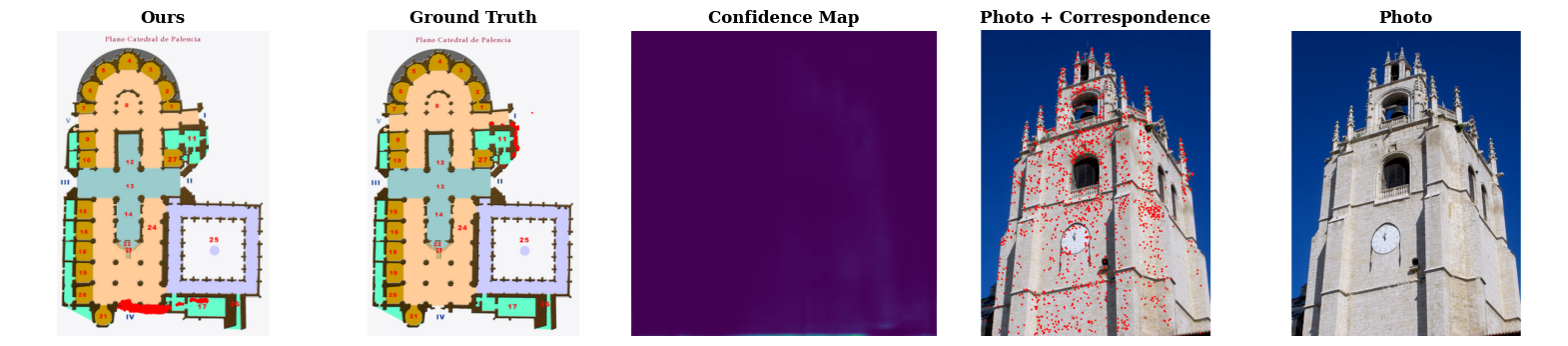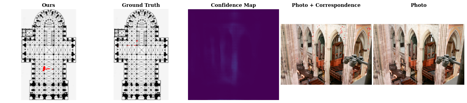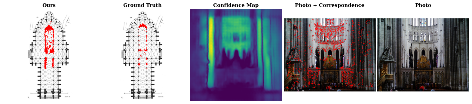 We find that correct correspondence predictions by C3Po is generally accompanied by high confidence scores, while incorrect predictions have low confidence scores. The photos from lower confidence results usually exhibit ambiguity, like the cases identified in Open Challenges, while it is more obvious to identify the camera pose of photos from the higher confidence results. This is further corroborated by the PR curves, which show that C3Po significantly outperforms state-of-the-art models because more confident correspondence predictions are more likely to be correct.