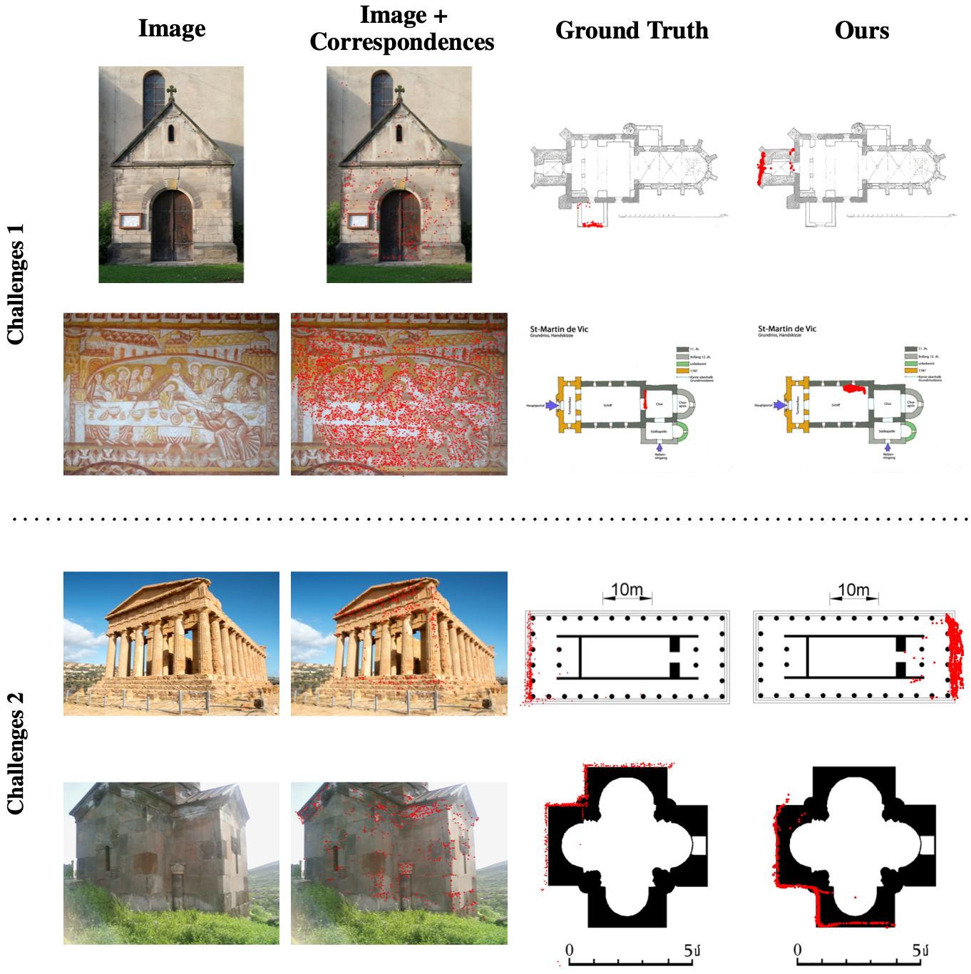We share two categories of data that our model struggles on. Challenge 1, top two rows, are cases where the photo provides minimal context clues of where it could be on the floor plan. Challenge 2, bottom two rows, are scenes that exhibit structural symmetry, where multiple correspondence alignments would seem plausible. In all cases, our model makes plausible predictions but the answers are wrong due to lack of context or structural ambiguity.